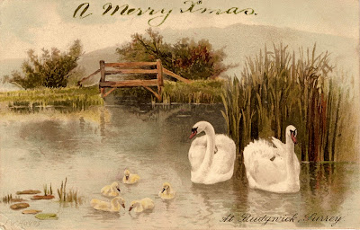 A chromolithographic Christmas postcard printed by Meissner& Buck of Leipzig and featuring swans at Rudgwick in Surrey. The Land or Province of Saxony in Germany was at this time a major centre of the chromolithography industry, especially for the the British postcard market. This all ended in 1914 with the outbreak of "The Great War".
