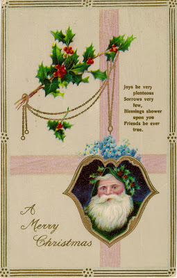 A traditionally styled Christmas card featuring Santa Claus, a verse, and a sprig of holly. The personage of "Father Christmas", "a jolly well-nourished bearded man dressed in a long, green, fur-lined robe", has in fact been a British custom since the 17th century.