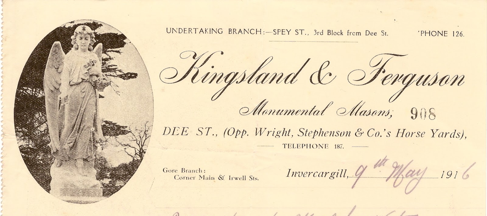 The above Monumental Mason's letterhead, being for "Kingsland & Ferguson" of Invercargill, New Zealand proudly illustrates an example of monumental work. Until cost became a consideration and council bylaws became more restrictive in recent years, many headstones were often exceedingly large and surprisingly elaborate. Sadly damage from weathering, instability of the ground, rusting iron supports and vandalism have taken their toll on many early and detailed headstones. The lack of funding does mean that little general remedial work can be undertaken. In the old Highgate cemetery in London the overgrown and crumbling nature of the tombs and mausoleums does lead a certain charm to the place. Conversely, in the large Ohlsdorf cemetery in Hamburg Germany the headstones are removed after 25 years if a fee is not paid by the family and the plot re-used plus the "occupants" of mausoleums removed. The cemetery is however neat and tidy with beautifully kept gardens.