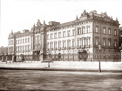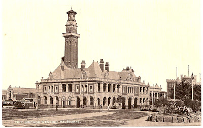 | The Princes Bridge, Melbourne with the earlier Flinders Street Railway Station across the Yarra River, a passenger carriage just being visible. Pre 1907 [From my own collection] |
