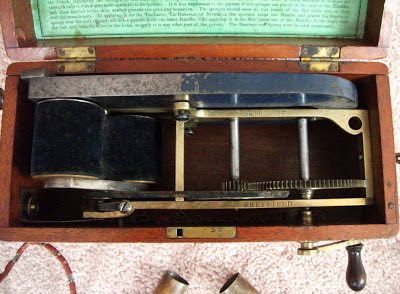 William Skidmore was active from 1850 to 1920 although I would date this machine to the 1870's - 1880's. I must say that it can "pack a punch" and is capable of making the muscles in my hands absolutely tighten up to the point of suffering quite some pain. But on a lower setting the tingling sensation actually feels quite pleasant. But does it actually cure "nervous diseases"?