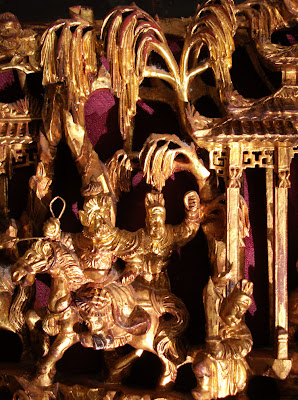 Apparently known as Chaozhou Woodcarving 潮州木雕 from South China's Guangdong Province, they would originally have been made to form part of a larger object of furniture or decorative element in the home of a wealthy person, both panels having a 'lip' at top and bottom to slot into a grooved holder. That there is some wear of the gilt down to the underlying red lacquer would strongly indicate that they were originally used for the purpose intended rather than being specifically made as stand-alone decorative items for the foreign market. The age of these items could easily range from the late 19th century up to the Chinese Revolution of 1911. I am possibly lucky that the items have not been re-gilded which I believe helps to preserve their historical authenticity and truly gives them that authentic 'aura' of age. Such gentle wear is now part of their history. Having observed and spoken with professional conservators at work I am a firm believer that 'over restoration' is not always a good thing and should be approached with caution.