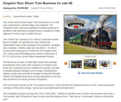 The iconic Kingston Flyer Steam Train, track, rail corridor, ancilliary equipment and buildings have again been placed on the open market at a virtual "give-away" price of NZD$2,500,000 (USD$2,133,000 or UKP£1,370,000)