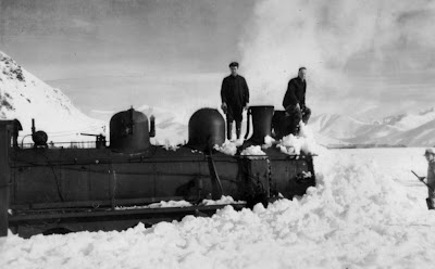 | "Snow Drift at Fairlight" - Our version of "Bleath Gill"! An AB Class Pacific stuck in a snow drift on the Fairlight Straight during the heavy snow fall of July 1939. It took three days to cover 37 miles. Photographed by the late Jim Graham. [Credit : Spankiebnz] |