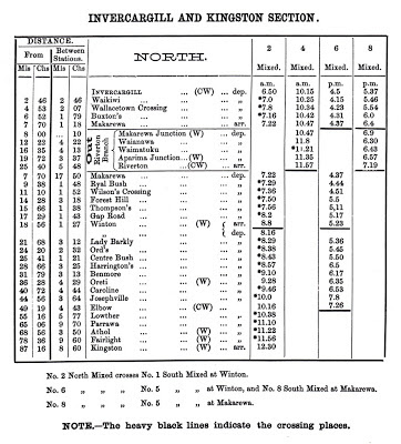 | The Working Timetable showing services north from Invercargill to Kingston effective July 1879 |