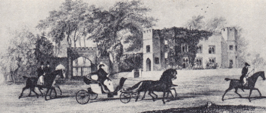| King George IV out in his pony-chaise, shown riding past Sandpit Gate Lodge on his way to view his menagerie. [From "Memoirs of George IV" by Robert Huish, 1830] |