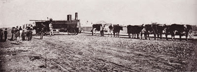 | In Disgrace - "Crampton" locomotive "Makarewa"[?] being pulled by a bullock team to Mr Fraser's Steam Saw Mills in July 1867 to be used on a bush tramway. |