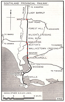 | The route of the "Great Northern Railway" from Invercargill to Makarewa and eventually to Winton |
