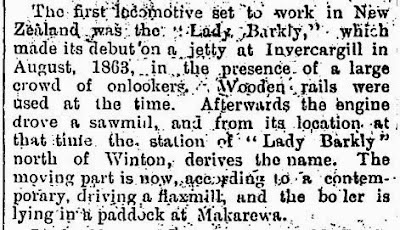 To further confuse matters, Mr John A Bennett of Tuatapere [died 2001 aged 91 years] advised "The Southland Times" in the early 1980's that the "Lady Barkly" supposedly finished its days carting timber for Raymond's Mill at Tuatapere. This information, which I was aware of even before this article hit the press, would now appear to be totally spurious. Mr Bennett claimed that at an auction of Raymond's Mill in 1925 his Father bought the "Lady Barkly", along with the mill engine but as the locomotive proved of little use, it was soon scrapped.