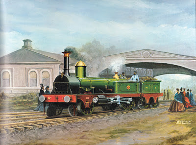 | An artist's impression of the "Lady Barkly" steaming along the wooden railway |
