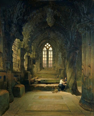 | Visitors inspecting the "Prentice Pillar" in Rosslyn Chapel. The entrance to the crypt is located under the window. A painting by David Roberts, 1843 |