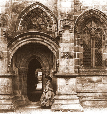 | A visitor at the south doorway of Rosslyn Chapel. Note the empty niches which once held "images of idolatry". A photograph by George Washington Wilson, pre 1888 |