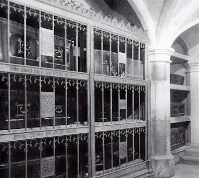 | An extremely rare late 19th century photo of coffins placed on stone shelves in the Royal Vault and covered with a Victorian era decorative grill. While we cannot specifically see the coffin of King George IV this image gives us a very clear impression of the arrangements within the vault. From a photograph by Sir Benjamin Stone. [Source : The Anglophile] |