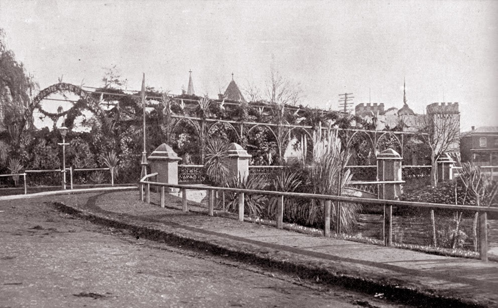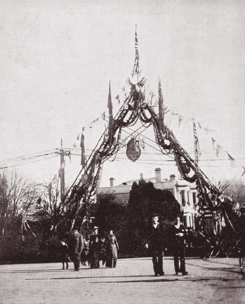 | The Government Floral Arches over Victoria Bridge [Source : "Royalty in New Zealand", 1901] |