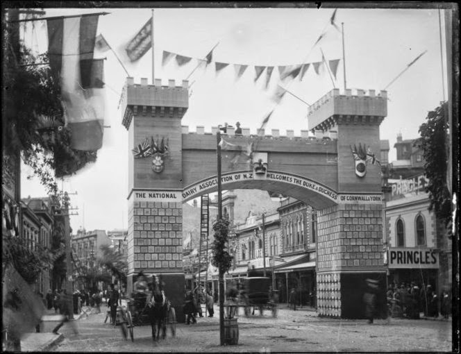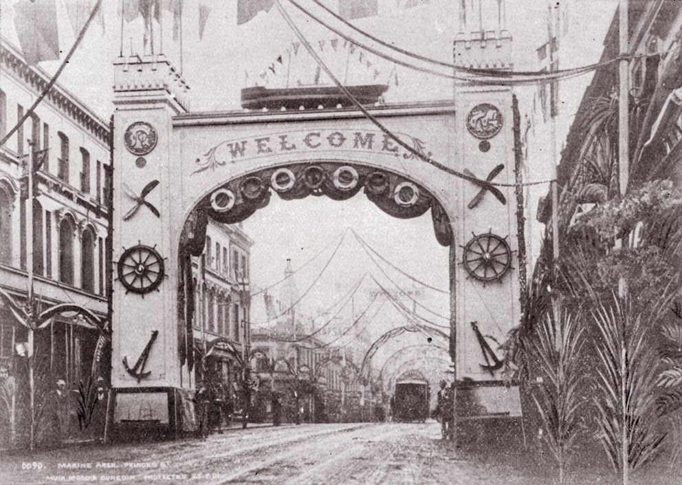 "...Two turreted towers, connected by an entablature, the broad frieze of which carried a large "Welcome;" the arcading hung with a row of life-buoys inscribed with the names of the Union [Steam Ship Company] fleet. The corners of the towers were softened with greenery, their faces carried the Royal and Ducal monograms with steering-wheels, anchors, propellors, and models of steamboats; above the entablature, lying across the street, was a model of the "Monowai", gay with a full dressing of flags; and on the frieze a great warm Celtic welcome, "Cead Mille Failthe." Various house-flags flew from the turrets; two tall flagpoles carried the Royal Standard and the Union Company's familiar house-flag. The arch, covered with canvas, looked like stone, and ta night was charmingly lighted."