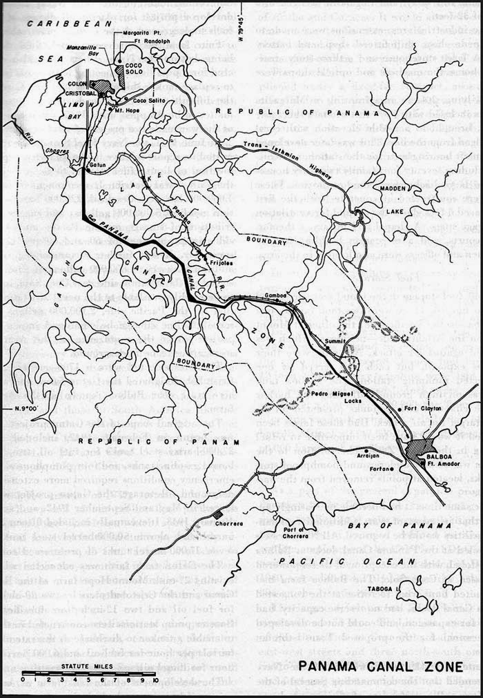 | A Map of the Panama Canal Zone Balboa is at right and Colon top left [Source : The Navy Dept Library] |