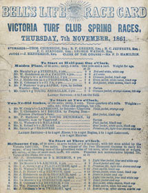 If you've read this far you might be interested in some wonderful footage (with reasonably convincing dubbed sound) of the Melbourne Cup from the 3rd November 1896, filmed by Marius Sestier and H. Walter Barnett. Racegoers are first shown arriving by train at Flemington Racecourse Railway Station then views of the crowds on the "lawn", horses etc before the actual race itself :