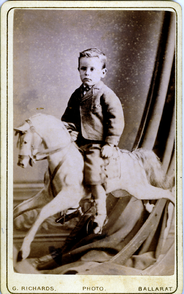 | Unknown boy on a rocking horse, Geo. Richards, Ballarat, Victoria, Australia. [Source : Dougall Collection] |