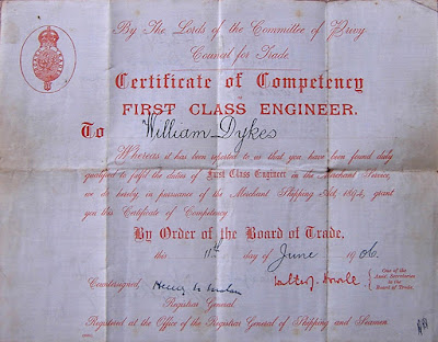My Grandfather, William Dykes (1880 - 1971), whom I remember well, spent the early years of the last century working as an Engineer on various cargo steamships, mostly voyages to South Africa, India and Ceylon (Sri Lanka) with the Scottish "Clan Line". His service on the "S.S. Otterburn" commencing in December 1907 was to be his eleventh and final voyage but also his longest and most interesting, not signing off until February 1910.