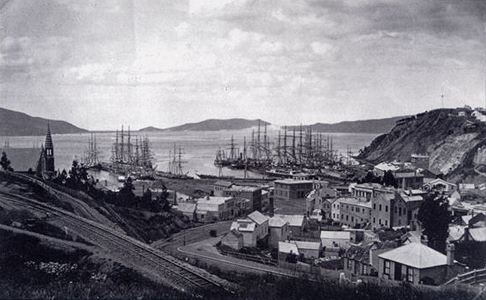 | The old Dunedin Railway Station at lower left, taken from the spire of First Church. Burton Brothers Photo, 1874 [Source : OESA Collection] |