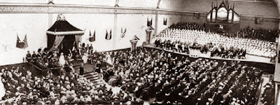 | The Exhibition Choir and Orchestra on stage in the Concert Hall, taken during the opening ceremony. [Source : "The Otago Witness"] |