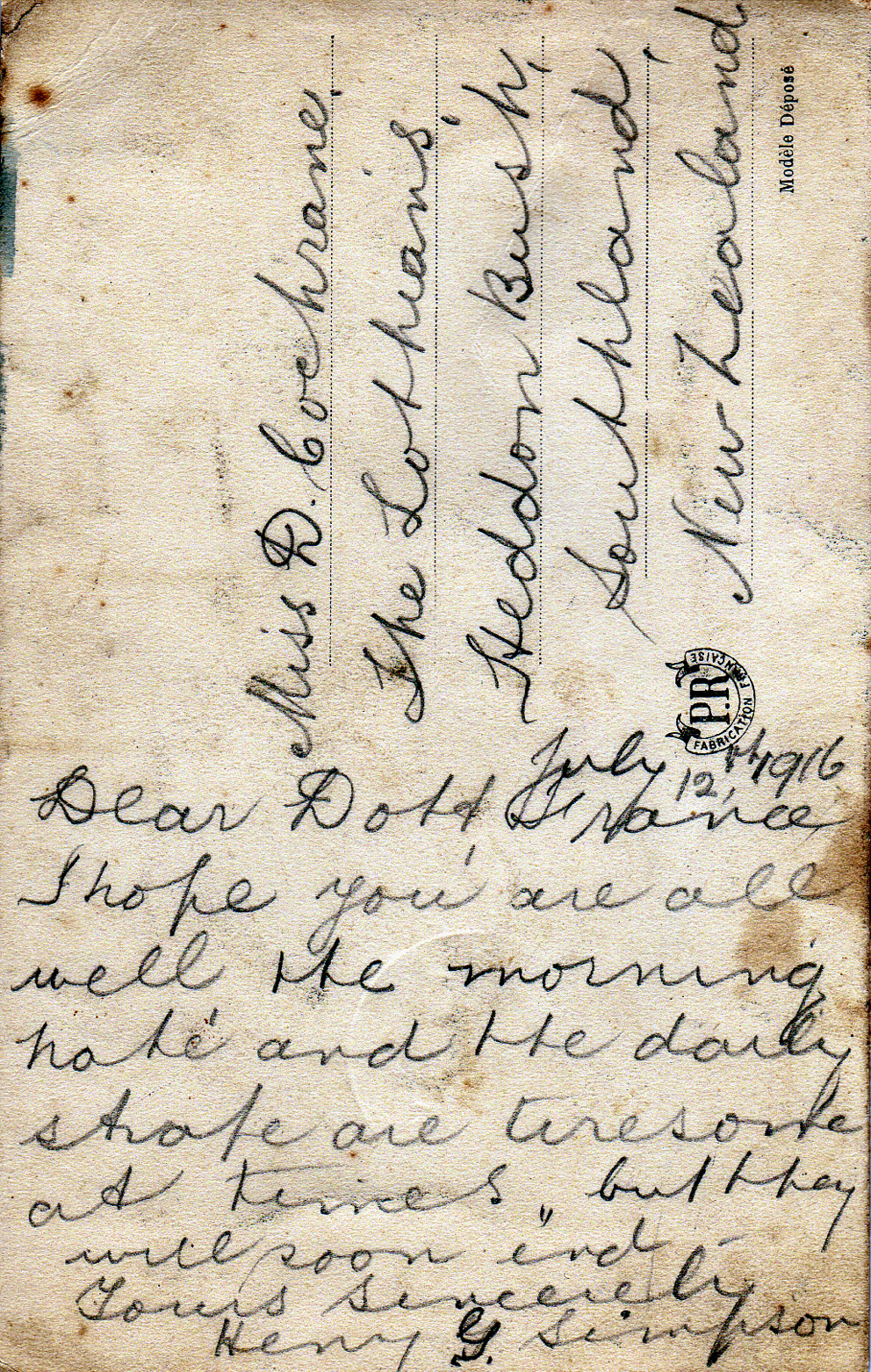 As a tribute to these men and women I am, by bringing together artefacts, photographs and information from a variety of sources, telling the story of a New Zealand World War One serviceman with a strong connection to both Otago and Southland, being Henry George Edward Simpson 8/2132.