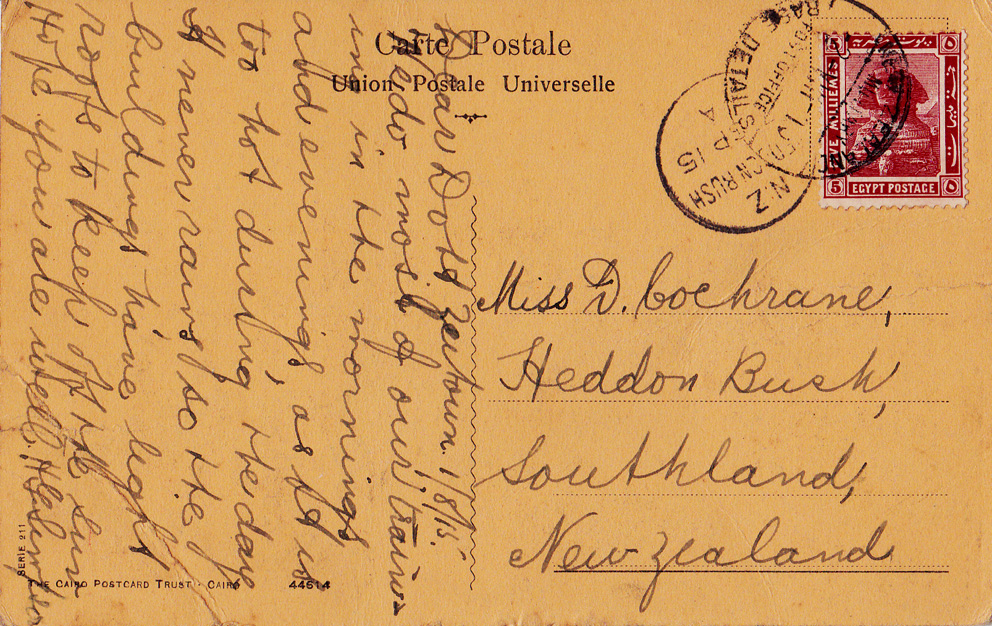 | A postcard from Zeitoun Camp, Egypt dated 1st August 1915 and sent to my Aunt. [From my own collection] |